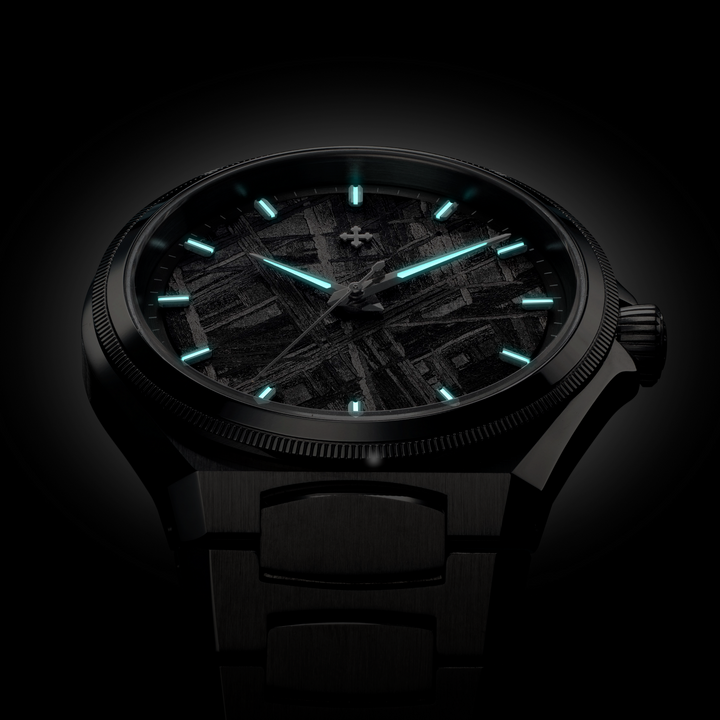 The Arsenale Meteorite blends the primordial energy of an extraterrestrial material with a sharp and essential design. Its dial, crafted from authentic meteorite, reveals a one-of-a-kind texture, shaped by billions of years of slow cooling in deep space. The satin-finished stainless steel case enhances its bold character, while the integrated bracelet gives the watch a modern and refined aesthetic.