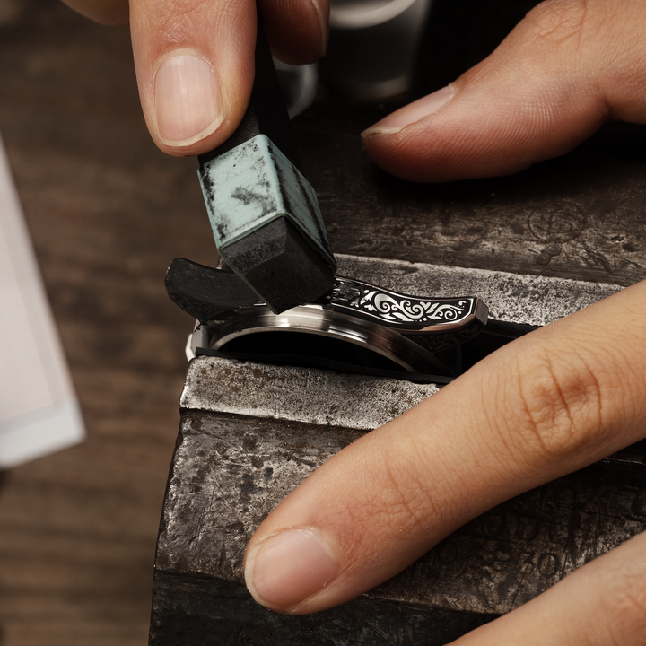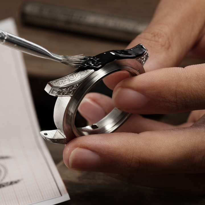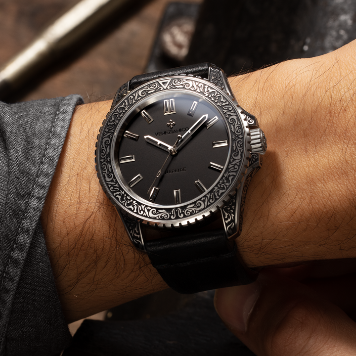 The Nereide Acquaforte stands out for its finely engraved case, adorned with a refined Renaissance pattern inspired by acanthus leaves, paying tribute to the timeless elegance of neoclassical art. The minimalist black dial, enhanced with polished indexes, strikes a perfect balance between aesthetics and functionality. For the first time, the indexes and hands are coated with Black Swiss Super-LumiNova®, emitting a subtle green glow to ensure impeccable readability even in low light, while staying true to the artistic and neoclassical essence of this timepiece.