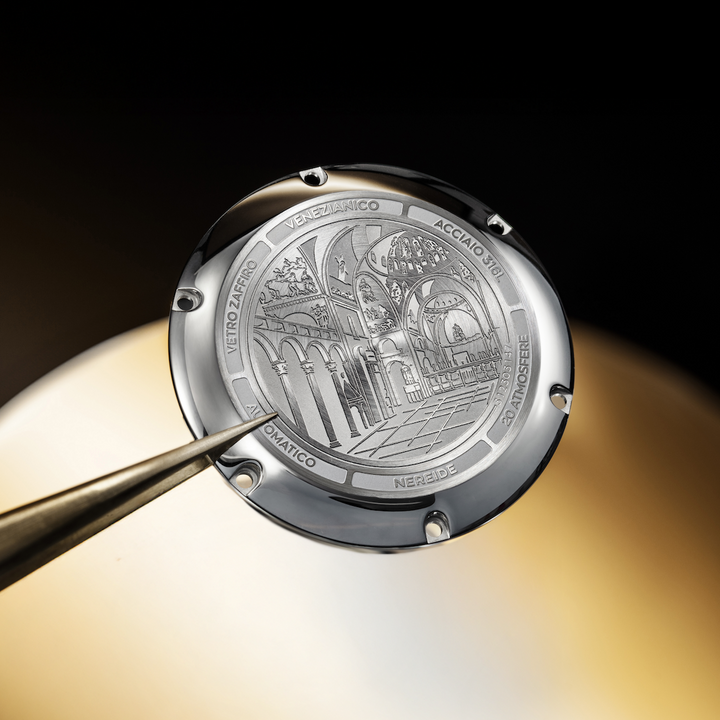 The Nereide Aureo is a dive watch that combines elegance and innovation. Its dial, adorned with a pure 24k gold treatment and a rippled finish, evokes the ancient Venetian art of lamination. The robust 316L stainless steel case, paired with a tungsten bezel, seamlessly integrates with the new Sansovino bracelet, featuring polished and satin-finished links and a micro-adjustable clasp that ensures durability and maximum comfort on the wrist.