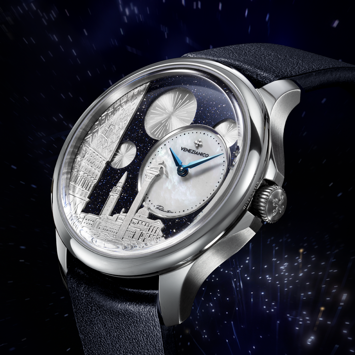The watch dial is an evocative representation of the Redentore celebration in Venice. Within the composition, St. Mark's Square comes to life at night, with the majestic Basilica di San Giorgio Maggiore in the background and the Doge's Palace on the left. At the center of the scene, the lion of St. Mark stands proudly, symbolizing the power of the Serenissima. The starry night envelops the scene, providing a magical and enchanting backdrop for the fireworks that light up the sky, creating an atmosphere of festivity and joy.